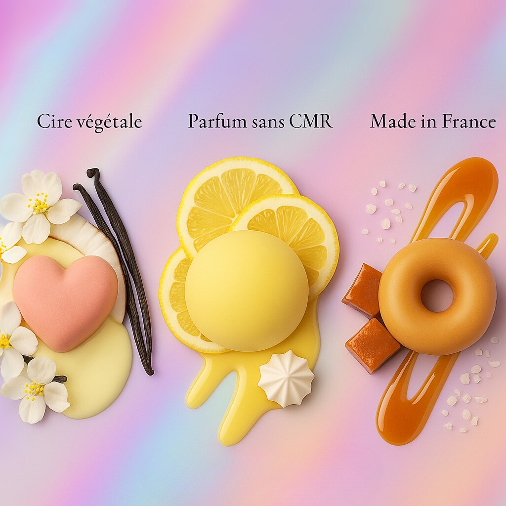 🌿 Nos fondants sont clean : à base de cire de colza européenne, sans CMR, sans phtalates, vegan, et respectueux de votre air intérieur.